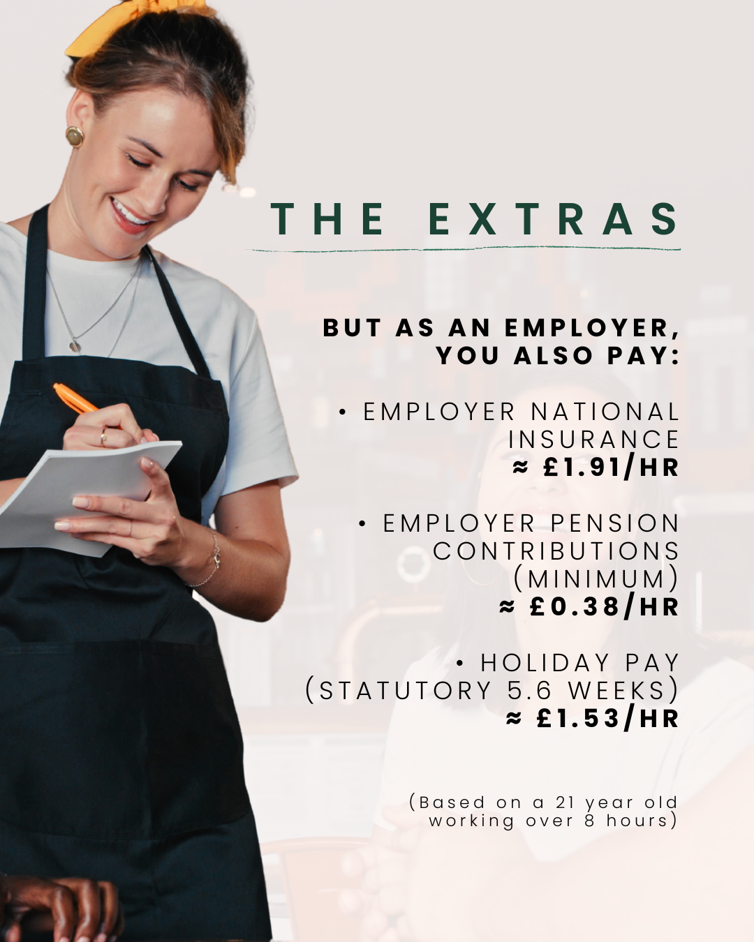 Based on a team member aged 21 or over, working more than 8 hours per week, employers are also responsible for the following statutory costs: